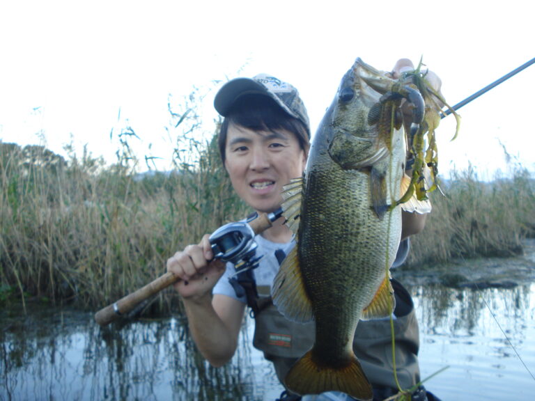 丁寧に沖のウィードをテキサスリグで探るとバイト!