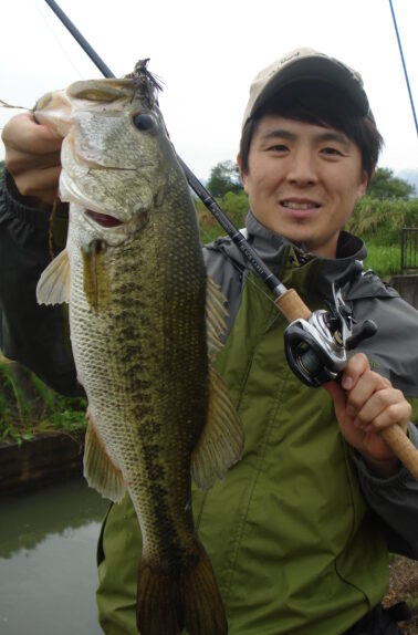 移動がてらに浅い水路の中を撃つと一発バイト。えっ、ココ!?